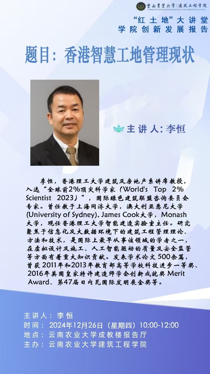 李恒,博士,香港理工大學(xué)建筑及房地產(chǎn)系講席教授,博士生導(dǎo)師,入選“全球前2%頂尖科學(xué)家(World's Top 2% Scientist 2023)”,國際綠色建筑聯(lián)盟咨詢委員會專家。曾任教于上海同濟(jì)大學(xué)、澳大利亞悉尼大學(xué)(University of Sydney)、James Cook大學(xué)、Monash大學(xué),現(xiàn)任香港理工大學(xué)智能建造實(shí)驗(yàn)室主任。研究聚焦于信息化及大數(shù)據(jù)環(huán)境下的建筑工程管理理論、方法和技術(shù),是國際上最早從事該領(lǐng)域的學(xué)者之一,在虛擬設(shè)計(jì)及施工、人工智能驅(qū)動的質(zhì)量及安全監(jiān)管等方面有著重大知識貢獻(xiàn)。發(fā)表學(xué)術(shù)論文500余篇,曾獲2011年和2013年教育部高等學(xué)??萍歼M(jìn)步一等獎、2016年英國皇家特許建造師學(xué)會創(chuàng)新成就獎Merit Award、第47屆日內(nèi)瓦國際發(fā)明展金獎等。