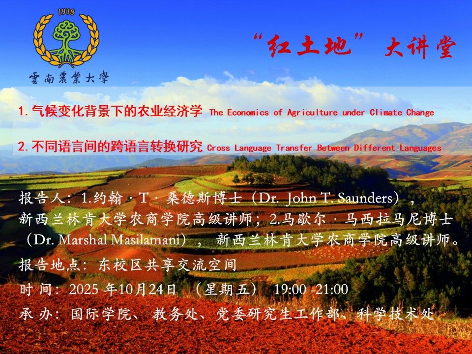 10月24日“紅土地”大講堂:1.The Economics of Agriculture under Climate Change,2.Cross Language Transfer Between Different Languages