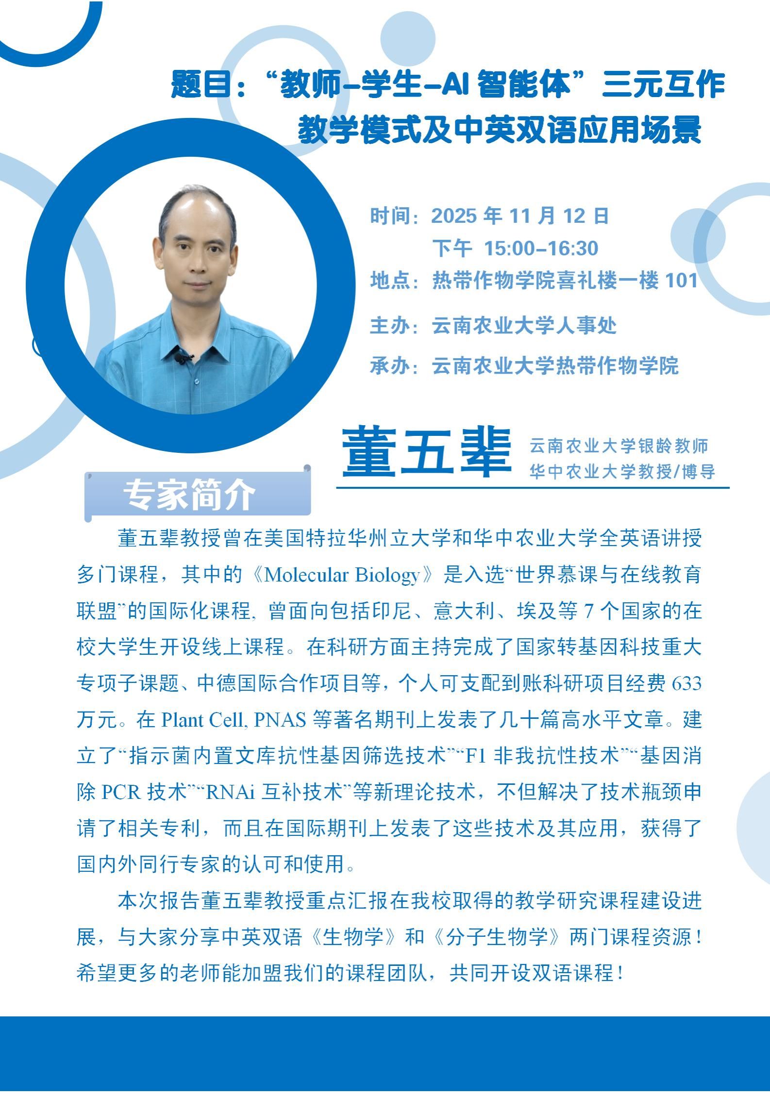 11月12日學術報告:“教師-學生-AI智能體”三元互作教學模式及中英雙語應用場景