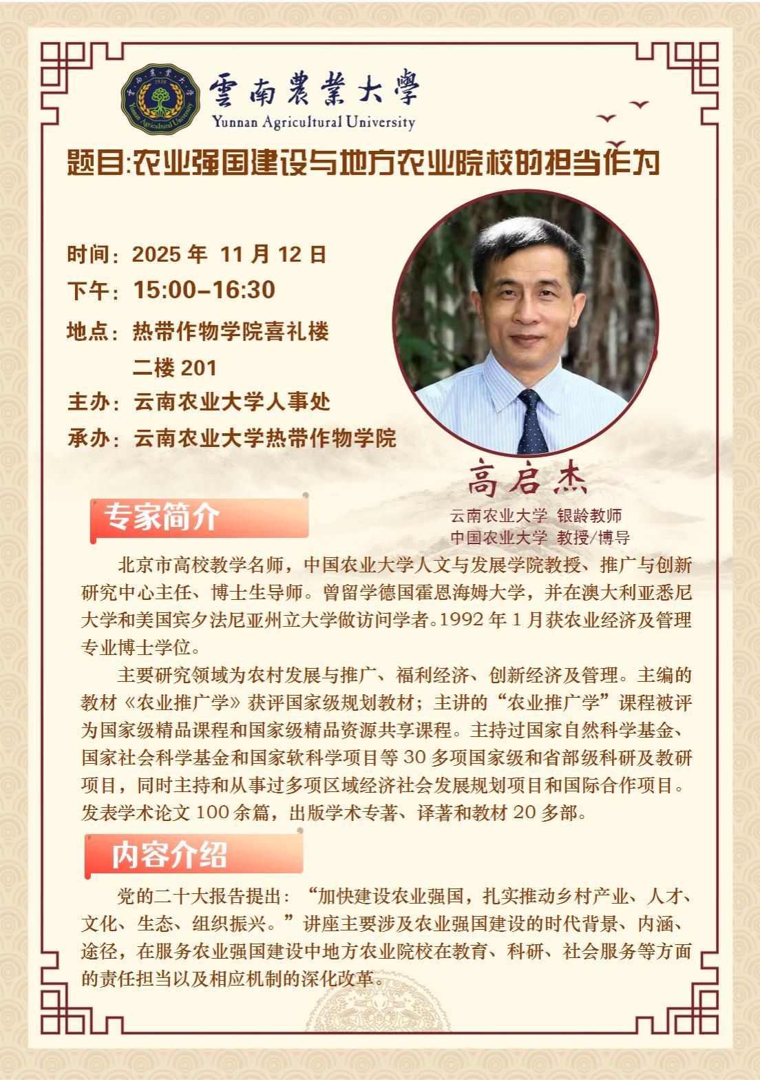 11月12日學術報告:農業強國建設與地方農業院校的擔當行為