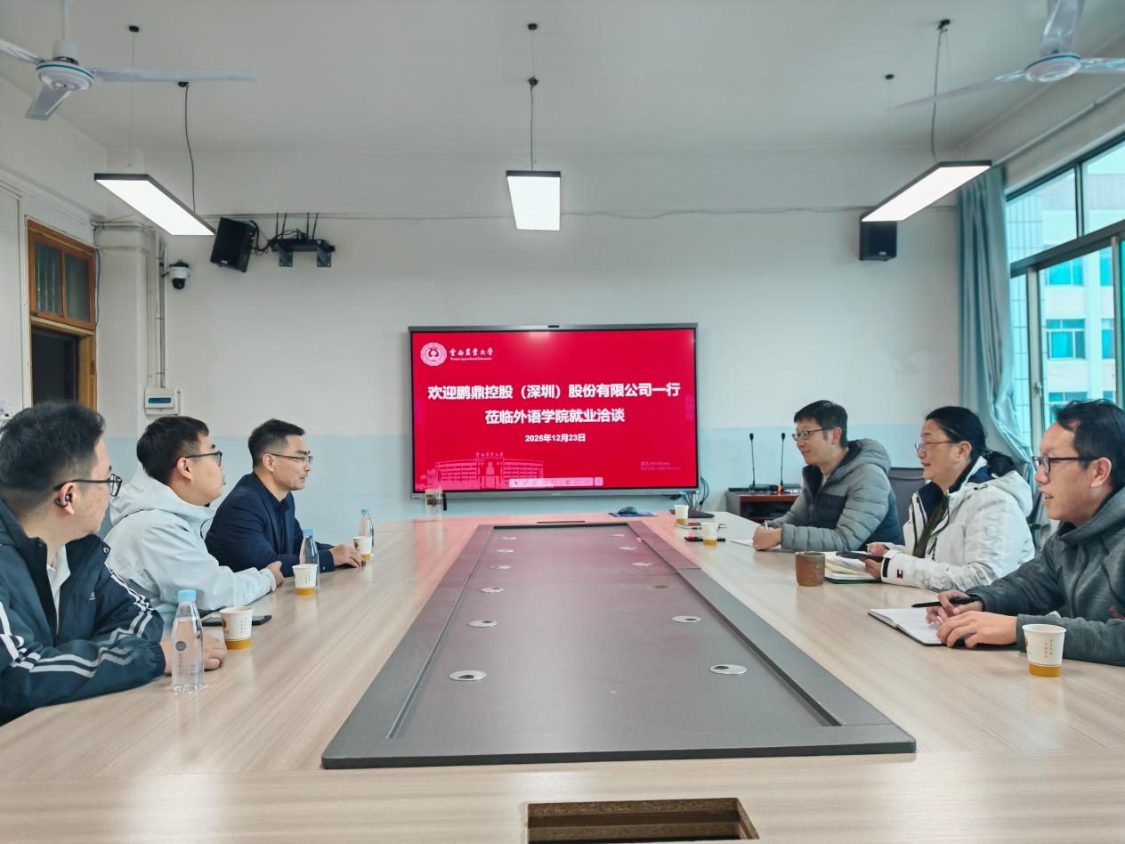 本站消息 12月23日,鵬鼎控股(深圳)股份有限公司人事負責人朱天宇一行3人到外語學院洽談院企合作。學院院長張吟松、東南亞語系系主任朱貴平參加座談,學院黨委副書記馮軍主持座談會。