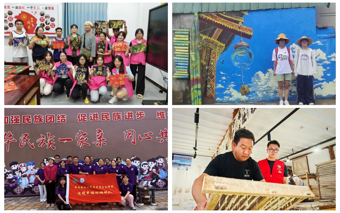 聚焦非遺保護,聯動地方政府、文化機構、非遺傳承人,開展“非遺活態傳承”行動。理學院“特色民族·情系家鄉”實踐隊深入西雙版納哈尼族、傣族聚居村落,開展少數民族文化調研與中華民族共同體意識實踐活動,參加哈尼族非遺傳承人二艷的非遺技藝體驗課堂,對滇絎草博物館阿卡然說三、傣族章哈玉叫、召詣傣院玉康坎等傳承人開展專題采訪,參加非遺工坊實踐,系統學習哈尼族、傣族非遺技藝、文化習俗及背后的精神內核,并通過制作短視頻、撰寫公眾號等,宣傳“中華民族一家親”的理念。園林園藝學院“彩墨凝邊·鄉境共織”實踐團在孟定鎮下壩社區派卡組參與派卡組村容村貌整治工作,圍繞“民族交融、邊疆發展”主題,通過實施“墻繪創作”和“鄉村閑置資源利用”,傳播民族文化,讓鄉土韻味與民族特色在環境改造中深度融合。建筑工程學院“彩畫尋蹤:麗江古建筑文化保護”實踐隊到麗江市古城區調研古建筑彩畫,開展彩畫歷史與保護知識科普講座;完成納西傳統民居建筑測繪,記錄麗江彩畫的紋樣體系、色彩配置與工藝特征,完成至少10處典型建筑構件的詳細數據采集,拍攝彩畫細節照片1200余張,建立典型彩畫紋樣與色彩數據庫,填補了滇西北多民族地區彩畫系統研究空白,為建筑彩畫史和民族藝術研究提供重要案例。動物醫學院“云嶺千峒·共牧興邦”實踐團參觀德宏州博物館,深入了解景頗族“目瑙縱歌”、傈僳族“闊時節”等民族文化的深厚內涵,通過視頻資料、實物展陳與場景復原,沉浸式體驗多民族交融的歷史與現實,深化了對祖國邊疆民族地區文化多樣性的理解。馬克思主義學院“福籽·怒江同心”邊疆實踐團聚焦怒江傈僳族自治州瀘水市邊境幸福村,通過實地考察、訪談、問卷調查等多種方式,深入了解幸福村在特色農業發展、民風民俗傳承、鄉村治理等方面的現狀與挑戰,總結經驗,發現問題,為推動邊境地區民族團結進步和鄉村振興提供參考依據。
