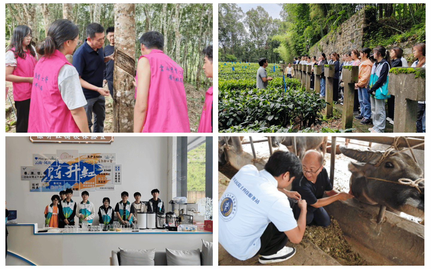 通過科技助農、產業提升等多維度幫扶,賦能鄉村振興,激活鄉村內生動力。熱帶作物學院“熱青滇邊實踐隊”深入孟連傣族拉祜族佤族自治縣勐馬鎮膠林開展橡膠種植全鏈條調研,推廣“斜口深割法”新技術,效率提升40%。協助村民制定《林下經濟扶持申請指南》,與孟連縣勐馬鎮簽訂了“橡膠產業創新合作協議”,實現校地合作“長效化”。茶學院“鳳鳴茶興·科技領綠”實踐團優化鳳慶縣茶葉加工工藝,開發2款創新風味咖啡配方,助力滇西茶咖產業升級,并向當地茶農派發《茶樹保護簡明手冊》,總結出鳳慶縣茶產業“數字化溯源”模式等一系列可復制、可推廣的成功經驗。動物醫學院“云嶺千峒·共牧興邦”實踐團,深入云南省德宏州邊境地區開展科技興農,通過可視化培訓、入戶調研、技術宣講等形式,推廣健康養殖與疫病防控知識,完成芒市科技服務站建設、基層培訓與器械捐贈等工作,擴充宣傳常見傳染病知識手冊、制作微紀錄片,助力于持續推進邊疆養殖產業升級與民族團結共興。動物科學技術學院“綠野循夢生態實踐團”在紅河州元陽縣,聚焦元陽縣種養循環體系中糞污資源化利用及生態農業發展,深入養殖場、專業合作社和農戶,提供現場技術指導和知識普及,形成了散養戶牛糞資源化處理方案,幫助企業降本增效,幫助農民科學處理畜禽糞污,通過科技支農助力綠色循環農業。動物科學技術學院“烽煙映初心·青春續華章”實踐團到迪慶藏族自治州香格里拉市金江鎮調研民族村寨,開展科技助農,搭建 “高校—村寨”長效對接橋梁,支持助力民族地區農業生產優化。熱帶作物學院“福籽同心,咖香筑夢”實踐團通過文獻研究、實地調研、分層訪談等多元方式,深入咖啡產業全鏈條與民族文化場景,完成調研任務的同時,實現了專業成長與責任擔當的雙重提升。