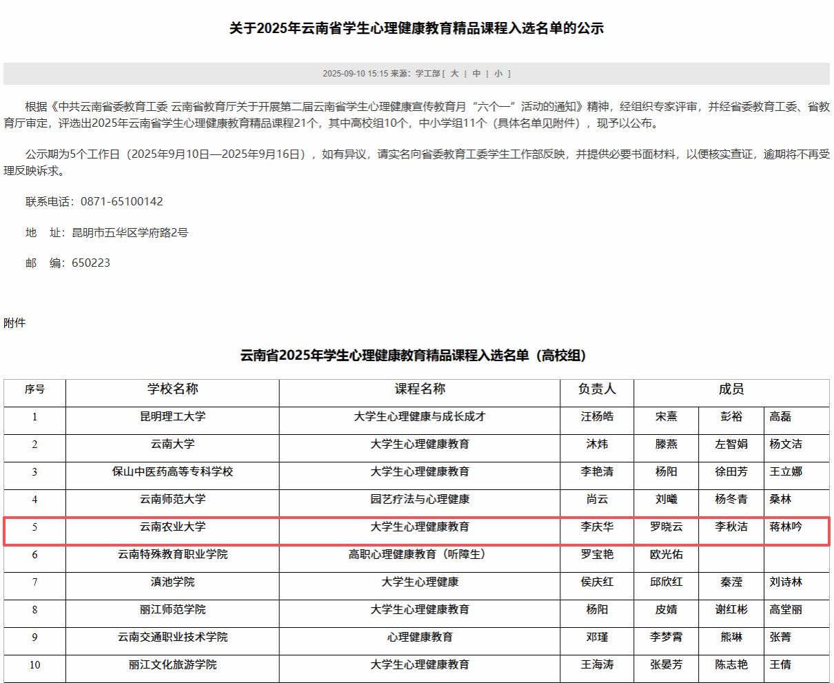 本站消息 近日,中共云南省委教育工委、云南省教育廳對2025年云南省學(xué)生心理健康教育精品課程入選名單進行公示,學(xué)校《大學(xué)生心理健康教育》課程成功入選高校組精品課程。