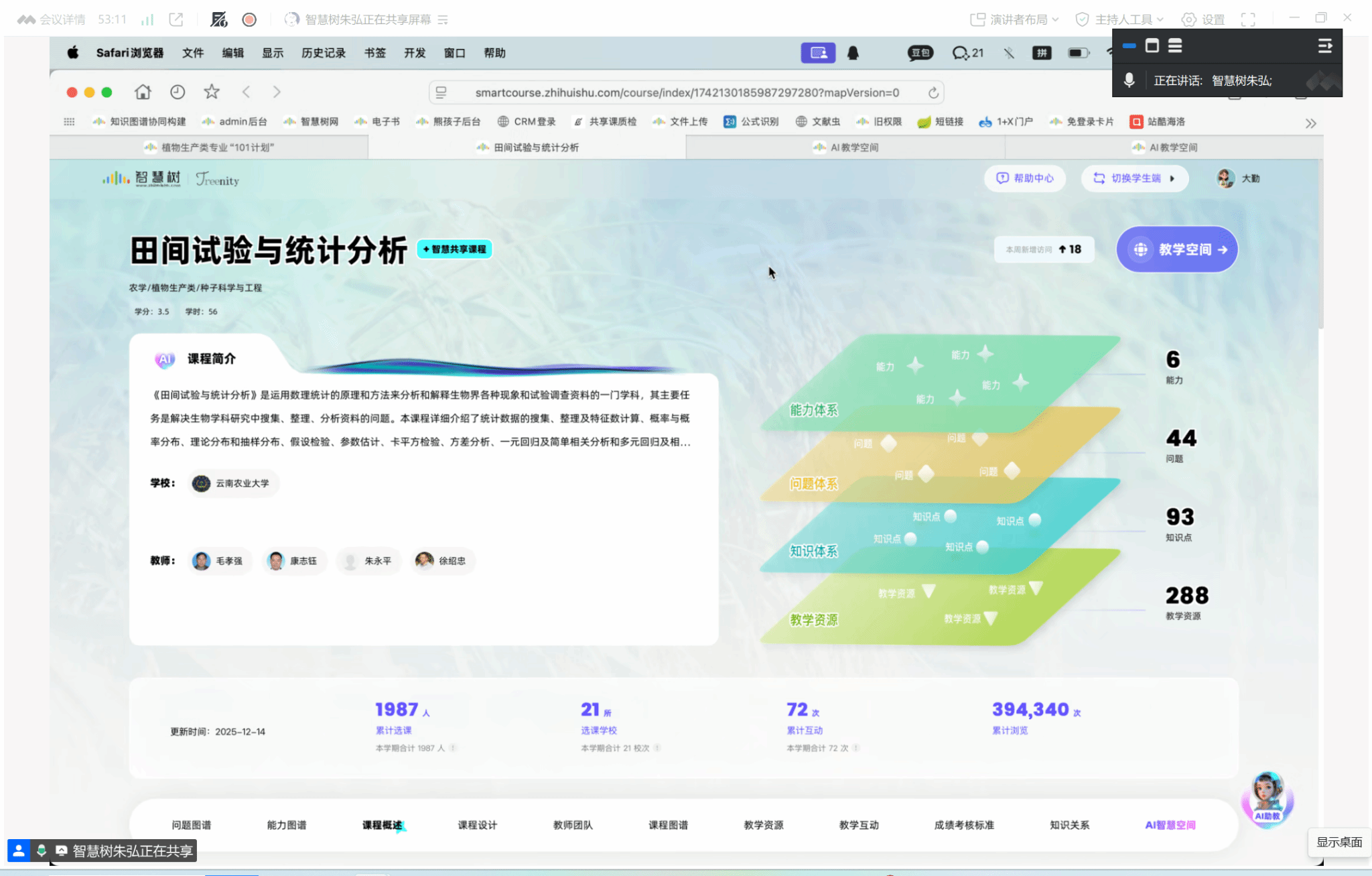 為了進一步貫徹落實地方“101計劃”工作要求,推進《田間試驗與統計分析》智慧課程建設,12月15日,在線召開了地方“101”計劃《田間試驗與統計分析》課程建設研討會暨智慧課程建設運行培訓會。